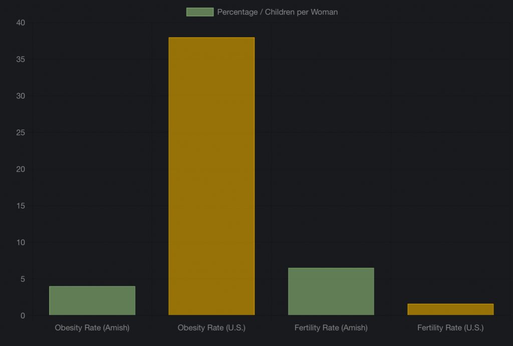 The bar chart above visually compares the approximate obesity and fertility rates between the Amish community and the general U.S. population. It highlights the significant difference in these key demographic and health indicators, illustrating the unique outcomes associated with the Amish lifestyle. The Amish show considerably lower obesity and much higher fertility, underscoring the impact of their cultural practices and daily habits on population health and growth.