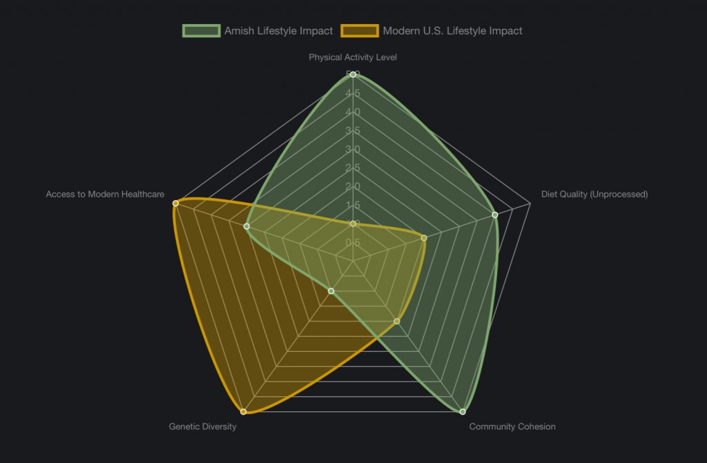 This radar chart illustrates a comparative analysis of key lifestyle factors between the Amish and a typical modern U.S. lifestyle, on a scale of 0 to 5. The Amish excel in areas like physical activity, diet quality, and community cohesion, reflecting protective health factors. Conversely, the modern U.S. lifestyle generally scores higher in genetic diversity and access to comprehensive modern healthcare. This visualization helps in understanding the contrasting strengths and weaknesses that contribute to the distinct health profiles of both groups.