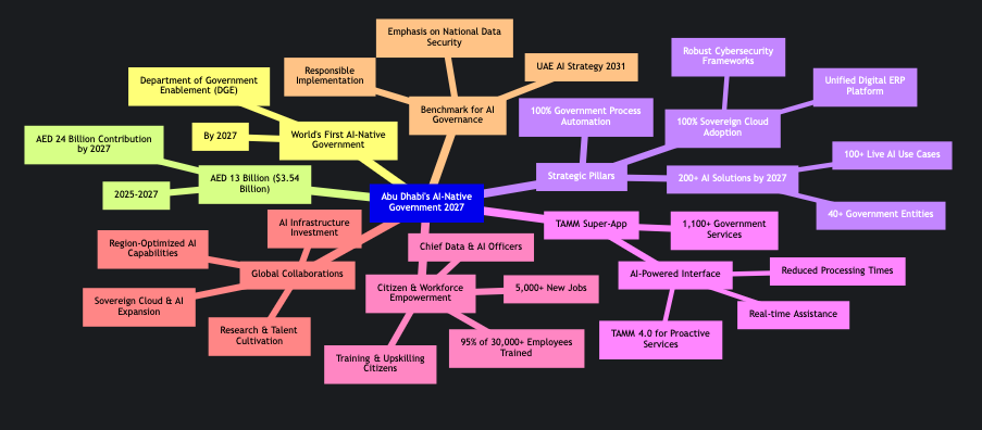 The following mindmap illustrates the interconnected strategic areas driving Abu Dhabi’s AI-native government transformation.