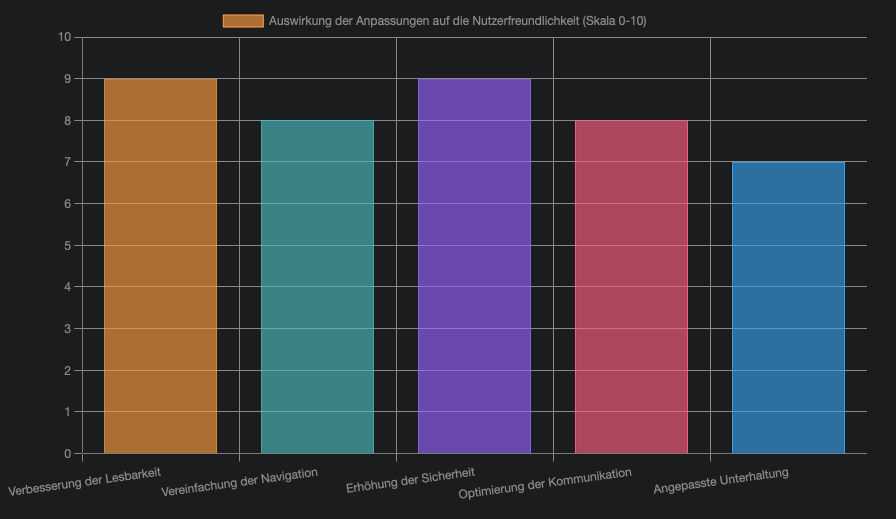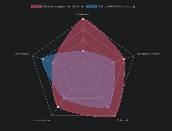 Dieser Radar-Chart vergleicht den Anpassungsgrad eines für Senioren optimierten iPads mit einer Standard-Einrichtung über verschiedene Dimensionen hinweg. Es wird deutlich, wie gezielte Anpassungen die Nutzererfahrung erheblich verbessern können.