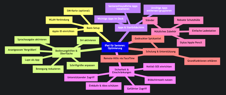 Dieser Mindmap visualisiert die verschiedenen Aspekte und Schritte zur optimalen Einrichtung eines iPads für Senioren, von den grundlegenden Einstellungen bis hin zu erweiterten Sicherheitsfunktionen und nützlichem Zubehör.