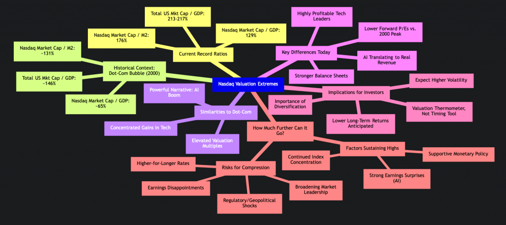 The interplay of various factors contributing to these extreme market valuations can be complex. This mindmap illustrates the key drivers, comparisons, and potential implications for the market’s trajectory.