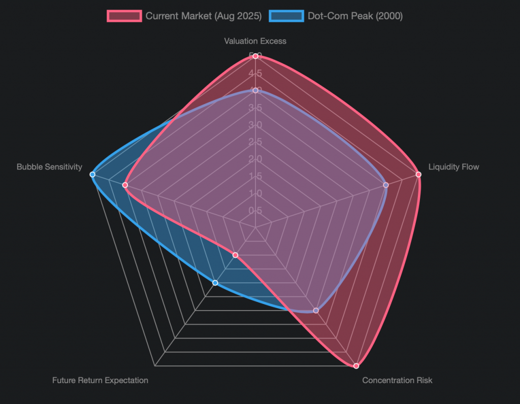 This radar chart visually compares the current market conditions in August 2025 with the Dot-Com Bubble peak in 2000 across several key dimensions. It highlights that while both periods showed significant “Valuation Excess” and “Liquidity Flow” into equities, the current market demonstrates a higher degree of “Concentration Risk” due to the dominance of a few mega-cap tech stocks. Consequently, “Future Return Expectation” appears lower for the current market due to already stretched valuations, and while “Bubble Sensitivity” was high in 2000, the current environment also exhibits significant fragility.