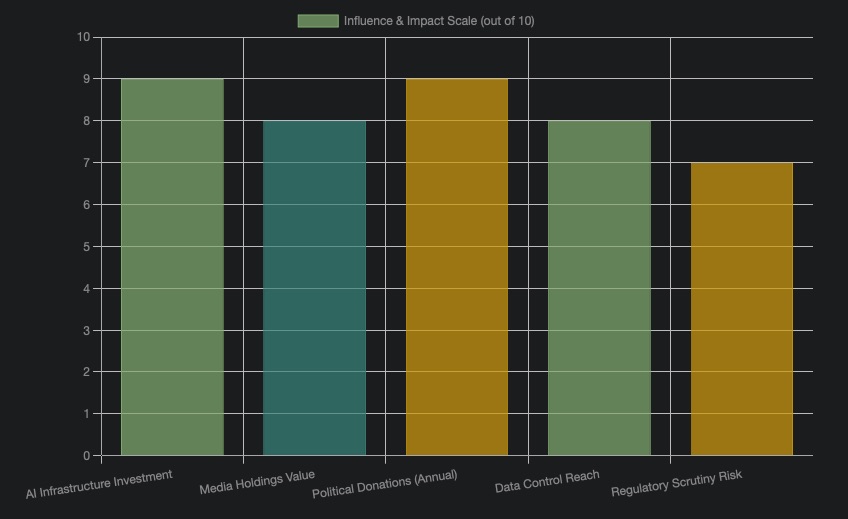 This bar chart quantifies various aspects of Larry Ellison’s influence, highlighting his substantial investments in AI infrastructure and media, significant political donations, and broad reach in data control, alongside the inherent regulatory scrutiny these activities attract.