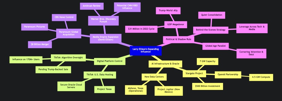 This mindmap visualizes the interconnected spheres of Larry Ellison’s influence, from his foundational role in AI infrastructure and digital platforms to the expansion of his family’s media empire and significant political contributions.