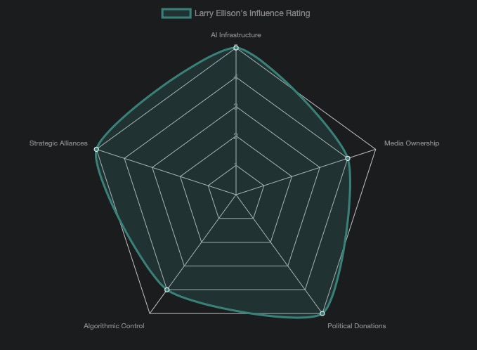This radar chart illustrates Larry Ellison’s multifaceted influence across key sectors, demonstrating his significant impact on AI infrastructure, political donations, and strategic alliances, alongside his growing control over media and algorithms.