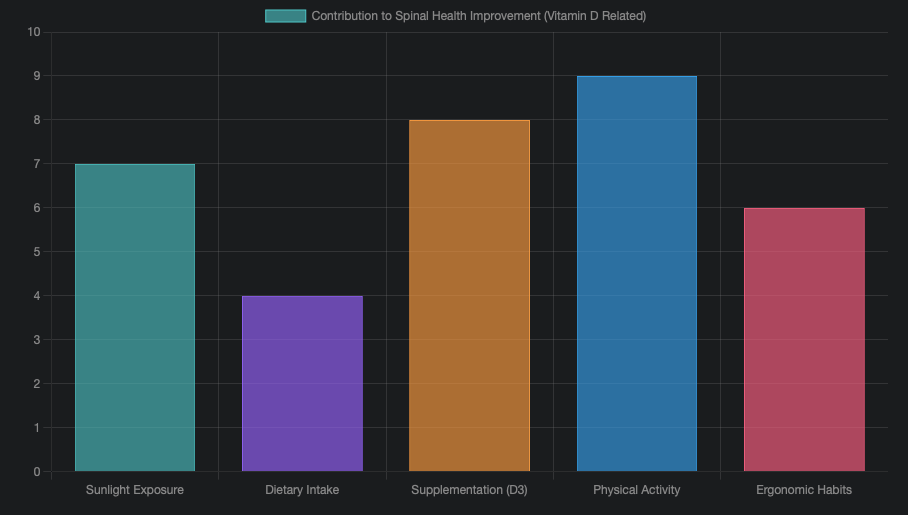 This bar chart compares the relative contribution of various factors to overall spinal health improvement, including Vitamin D related strategies and broader lifestyle elements, on a scale of 0 to 10.