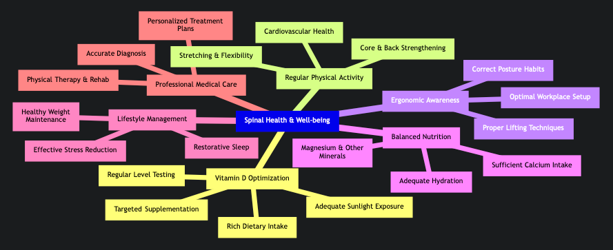 A mindmap illustrating the various interconnected factors that contribute to overall spinal health, with Vitamin D optimization as a key component.