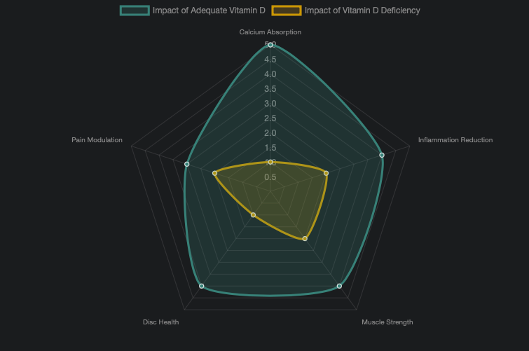 This radar chart illustrates the perceived impact of both adequate Vitamin D levels and Vitamin D deficiency across key aspects of spinal health, rated on a scale of 0 to 5.