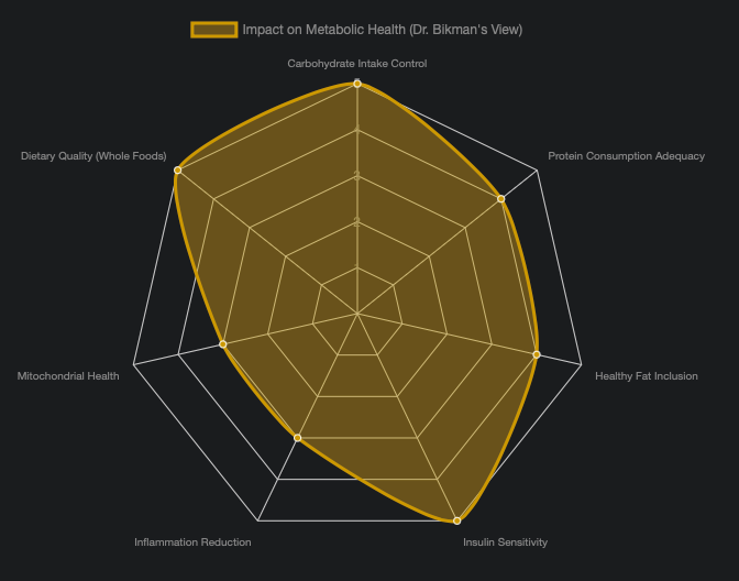Based on the comprehensive insights from Dr. Benjamin Bikman, here is an opinionated assessment of various metabolic factors and their perceived influence on overall health. This radar chart visualizes the relative importance and impact of these elements as emphasized in his work.