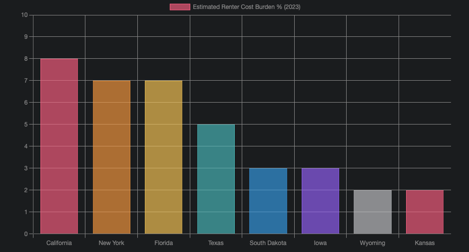 Housing affordability is not uniform across the United States. The severity of the cost burden varies significantly by state and metropolitan area. States like California and Florida consistently report higher shares of cost-burdened renters, driven by high housing costs and competitive markets. In contrast, states such as the Dakotas and Iowa tend to have lower rates of cost-burdened renters, offering relatively more affordable housing options.