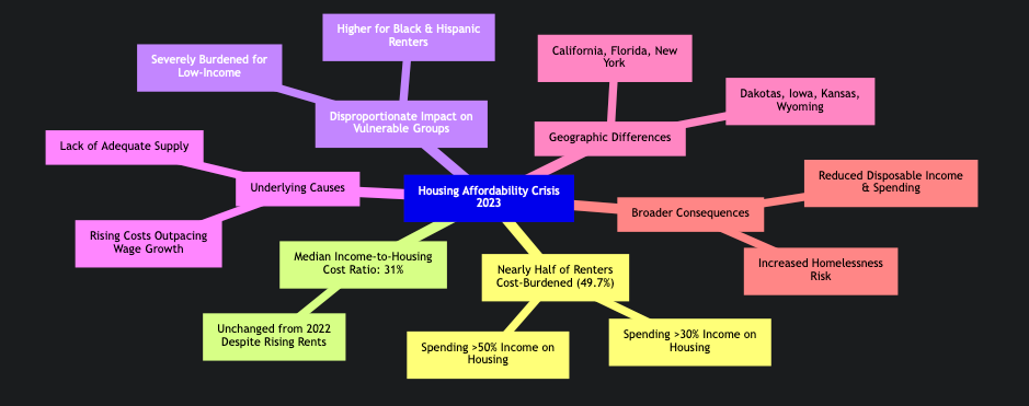 This mindmap provides a structured overview of the housing affordability crisis in 2023. It branches out to cover key aspects such as the definition of cost burden, the median income-to-housing cost ratio, the disparities affecting vulnerable groups, the contributing factors behind the crisis, regional variations in affordability, and the broader societal impacts.