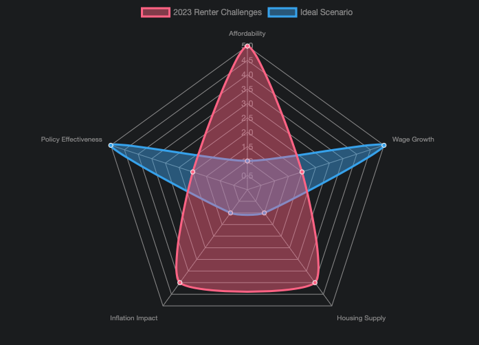 This radar chart visually represents key factors influencing renter affordability. “Affordability” and “Inflation Impact” are high for “2023 Renter Challenges,” indicating significant issues, while “Wage Growth,” “Housing Supply,” and “Policy Effectiveness” are low, pointing to areas where current conditions fall short of ideal. Conversely, the “Ideal Scenario” dataset shows the desired state for each factor, highlighting the stark contrast with current realities.