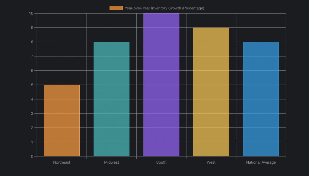 This bar chart compares the year-over-year inventory growth across different U.S. regions, highlighting where supply is increasing most significantly.