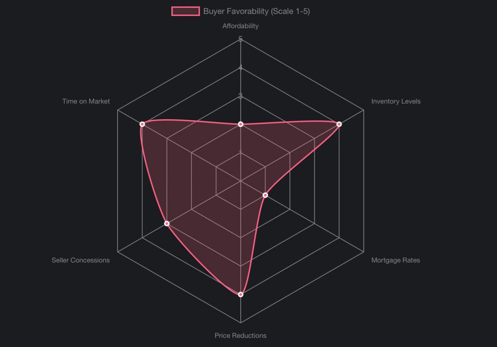 This radar chart illustrates the perceived strength of various market factors from a buyer’s perspective. A higher score indicates a more favorable condition for buyers, while a lower score suggests challenges.