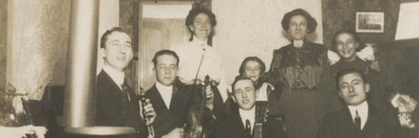 A vintage photograph depicting a family engaging in music, highlighting the cultural capital often cultivated in home environments.