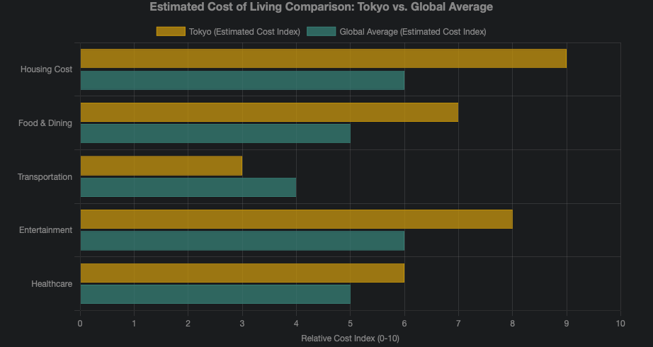 This bar chart illustrates an estimated comparison of the cost of living in Tokyo across various categories against a hypothetical global average. It highlights that while Tokyo excels in transportation efficiency, other aspects like housing can be significantly more expensive, impacting overall affordability for residents.