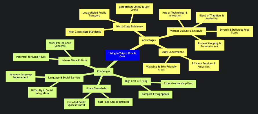 This mindmap visually summarizes the key advantages and challenges of living in Tokyo. It highlights how factors like public transport efficiency and cultural richness contribute to its appeal, while aspects such as the high cost of living and demanding work culture represent significant hurdles for some.