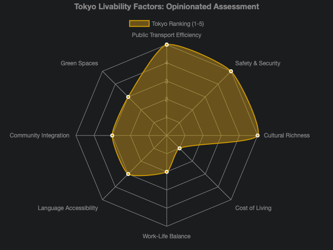 To further understand Tokyo’s appeal and its potential drawbacks, we can evaluate various aspects of urban living. The following radar chart provides an opinionated analysis of how Tokyo performs across key livability criteria, from infrastructure to social integration.