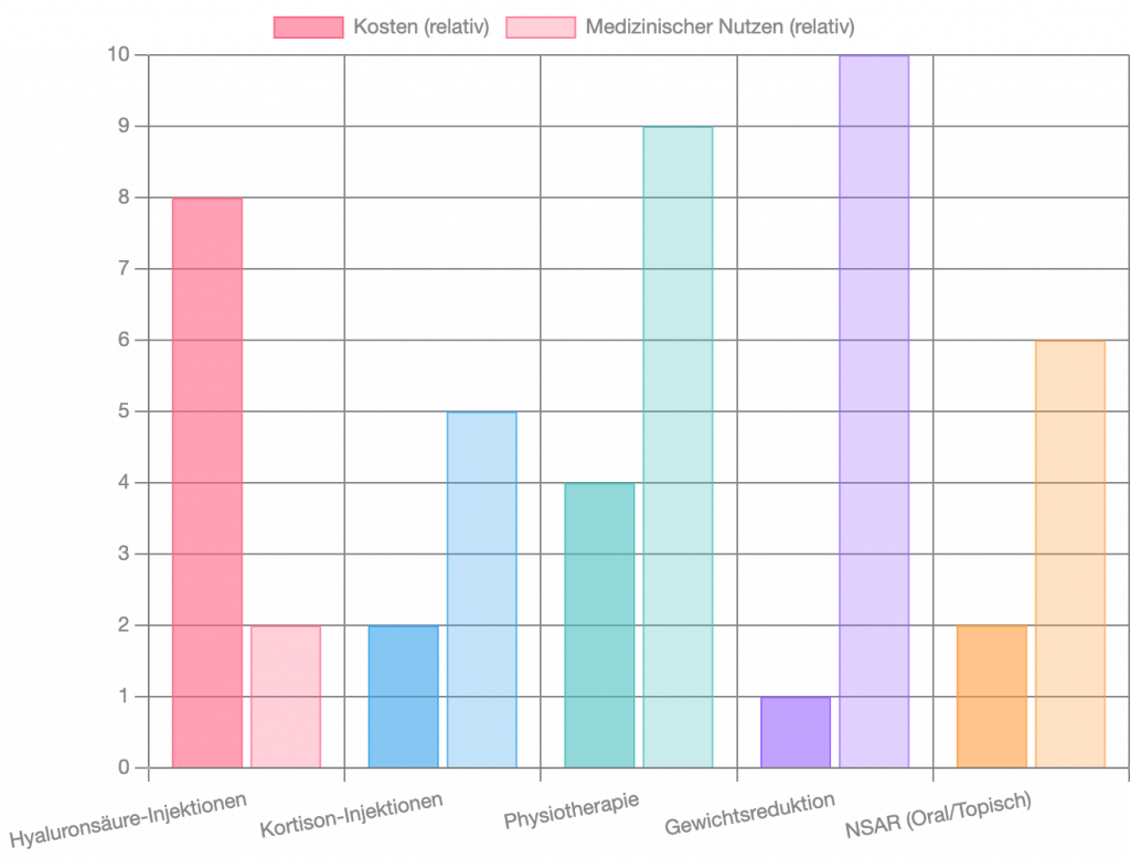 Dieses Balkendiagramm veranschaulicht das Verhältnis von Kosten zu medizinischem Nutzen für verschiedene Arthrose-Behandlungen. Es wird deutlich, dass Therapien wie Hyaluronsäure-Injektionen hohe Kosten verursachen, während ihr medizinischer Nutzen als gering eingestuft wird. Im Gegensatz dazu bieten nicht-medikamentöse Ansätze wie Gewichtsreduktion und Physiotherapie einen hohen medizinischen Nutzen bei vergleichsweise niedrigen Kosten, was die Empfehlung der Krankenkassen für diese evidenzbasierten Therapien untermauert.