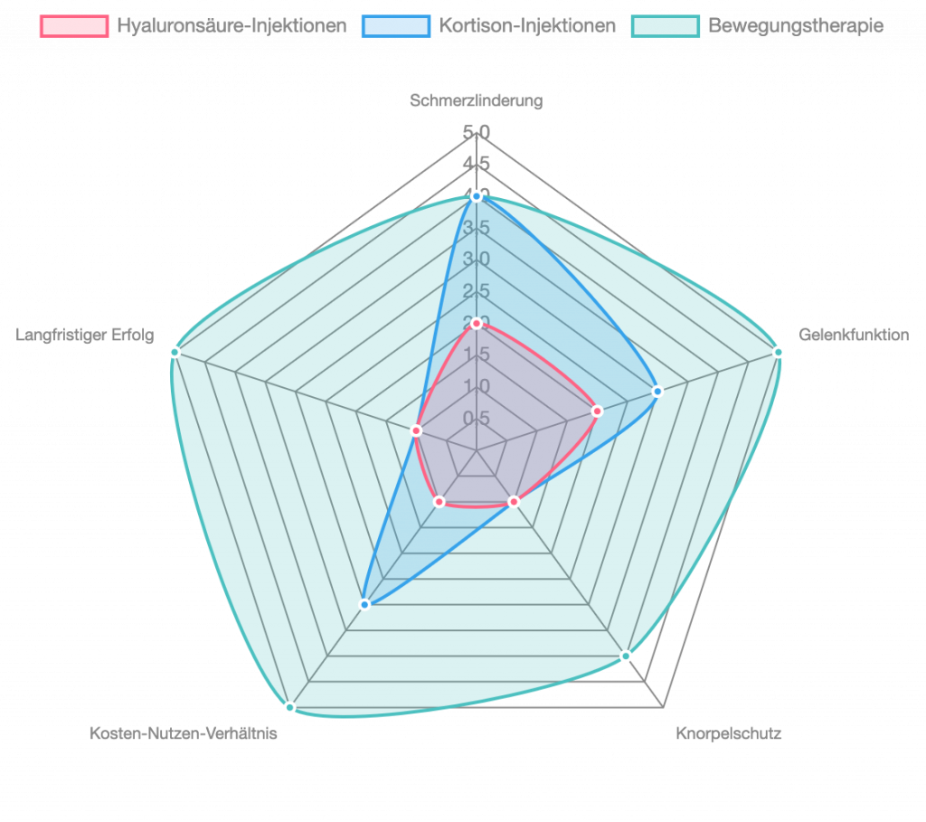 Dieses Radar-Diagramm vergleicht die wahrgenommene Wirksamkeit und Effizienz verschiedener Arthrose-Therapien. Es zeigt, dass die Bewegungstherapie in den meisten Bereichen – von der Schmerzlinderung über die Gelenkfunktion bis zum langfristigen Erfolg – die höchsten Werte erzielt, was ihre Rolle als Goldstandard in der Arthrosebehandlung unterstreicht. Im Gegensatz dazu zeigen Hyaluronsäure- und Kortison-Injektionen Schwächen in Bereichen wie dem Knorpelschutz und dem langfristigen Nutzen, was die Warnungen der Krankenkassen untermauert.