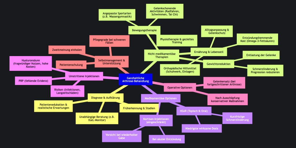 Die Mindmap verdeutlicht, dass die Basis der Arthrose-Behandlung auf nicht-medikamentösen Säulen wie Bewegung, Gewichtsreduktion und Ernährung ruht. Medikamentöse Ansätze wie NSAR dienen der Schmerzlinderung, während Injektionstherapien, insbesondere Hyaluronsäure und PRP, aufgrund ihrer fragwürdigen Wirksamkeit und hoher Kosten als umstritten gelten. Operative Eingriffe sind eine Option für fortgeschrittene Fälle nach Ausschöpfung aller konservativen Methoden. Diese umfassende Sichtweise hilft Patienten und Ärzten, fundierte Entscheidungen zu treffen.