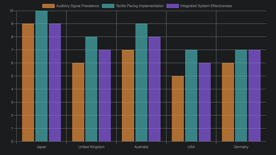 This bar chart compares the estimated prevalence and effectiveness of auditory signals, tactile paving, and integrated system effectiveness across different countries. Japan consistently scores highly, demonstrating its leadership in comprehensive pedestrian accessibility.