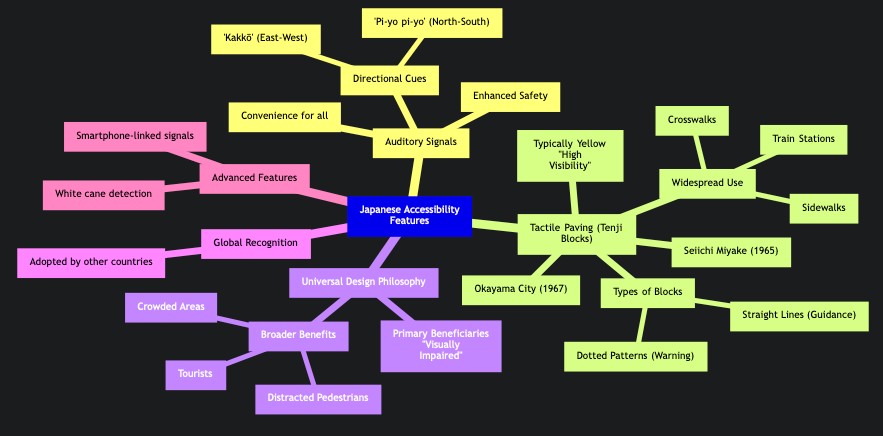 This mindmap visually outlines the comprehensive nature of Japan’s pedestrian accessibility features, highlighting the interconnectedness of auditory signals, tactile paving, and the overarching philosophy of universal design.