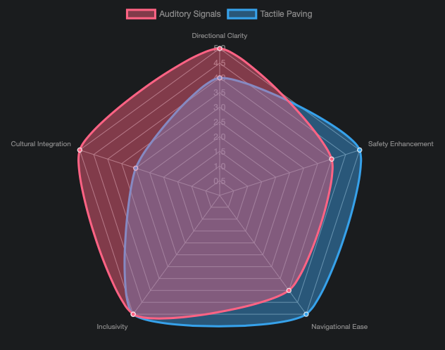 This radar chart illustrates the perceived strengths of Japan’s auditory signals and tactile paving in various aspects of urban accessibility. Auditory signals excel in cultural integration and immediate directional clarity, while tactile paving provides superior navigational ease and safety for physical guidance. Both contribute significantly to overall inclusivity.