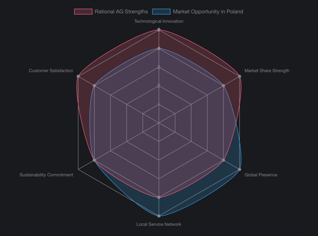 This radar chart illustrates how Rational AG’s inherent strengths align with the market opportunities in Poland. High scores indicate strong performance or significant potential. For example, “Technological Innovation” is a strong suit for Rational, and this innovation is highly valued in the Polish market seeking modern solutions.