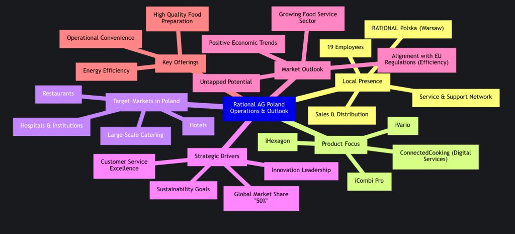 This mindmap provides a comprehensive overview of Rational AG’s multifaceted approach to the Polish market, detailing its local presence, product focus, target segments, strategic drivers, and overall market outlook. It clearly shows how each element contributes to the company’s success in the region.