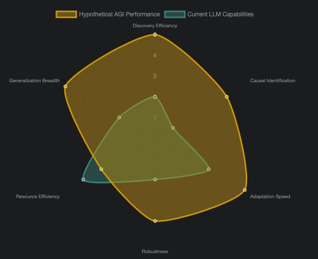 This radar chart illustrates a hypothetical comparison between a fully realized “artificial scientist” AGI and current large language models (LLMs) across several key metrics. The AGI is expected to significantly outperform LLMs in areas like discovery efficiency, causal identification, adaptation speed, and generalization breadth, reflecting its core design principles. LLMs, while strong in some aspects like certain forms of resource efficiency (given their optimized architectures), generally fall short in truly scientific and broad adaptive capacities.