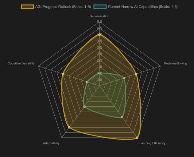 This radar chart illustrates the perceived gap between current narrow AI capabilities and the aspirational characteristics of AGI, based on an opinionated assessment of progress in key areas such as generalization and problem-solving.